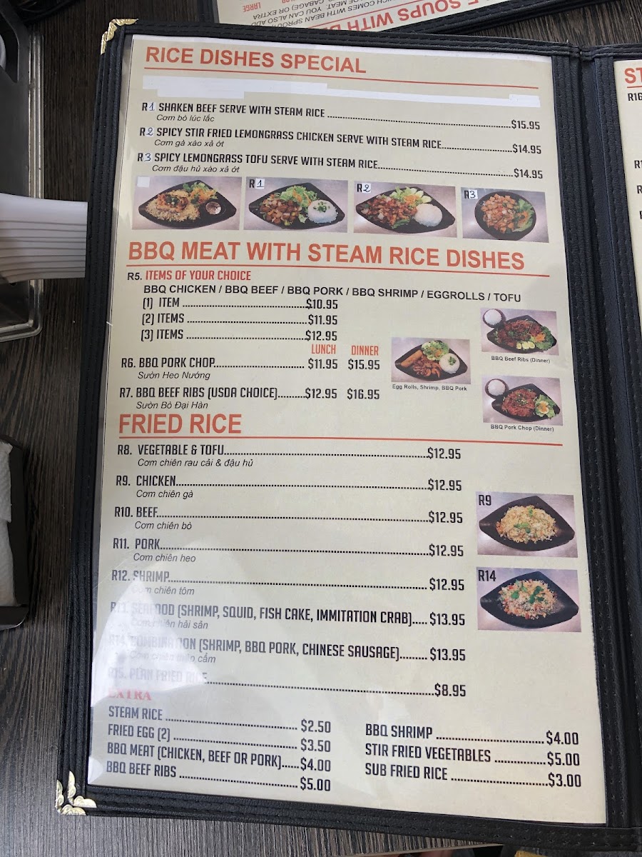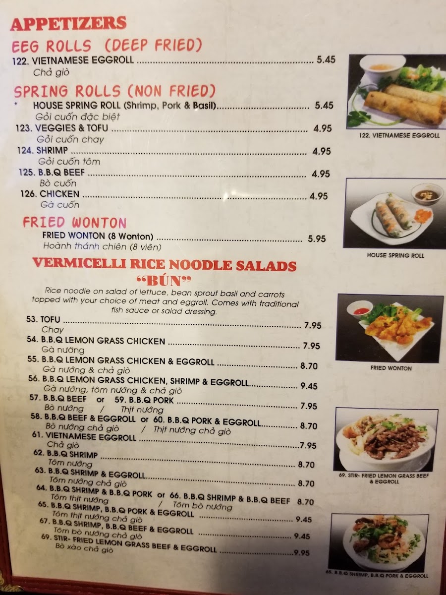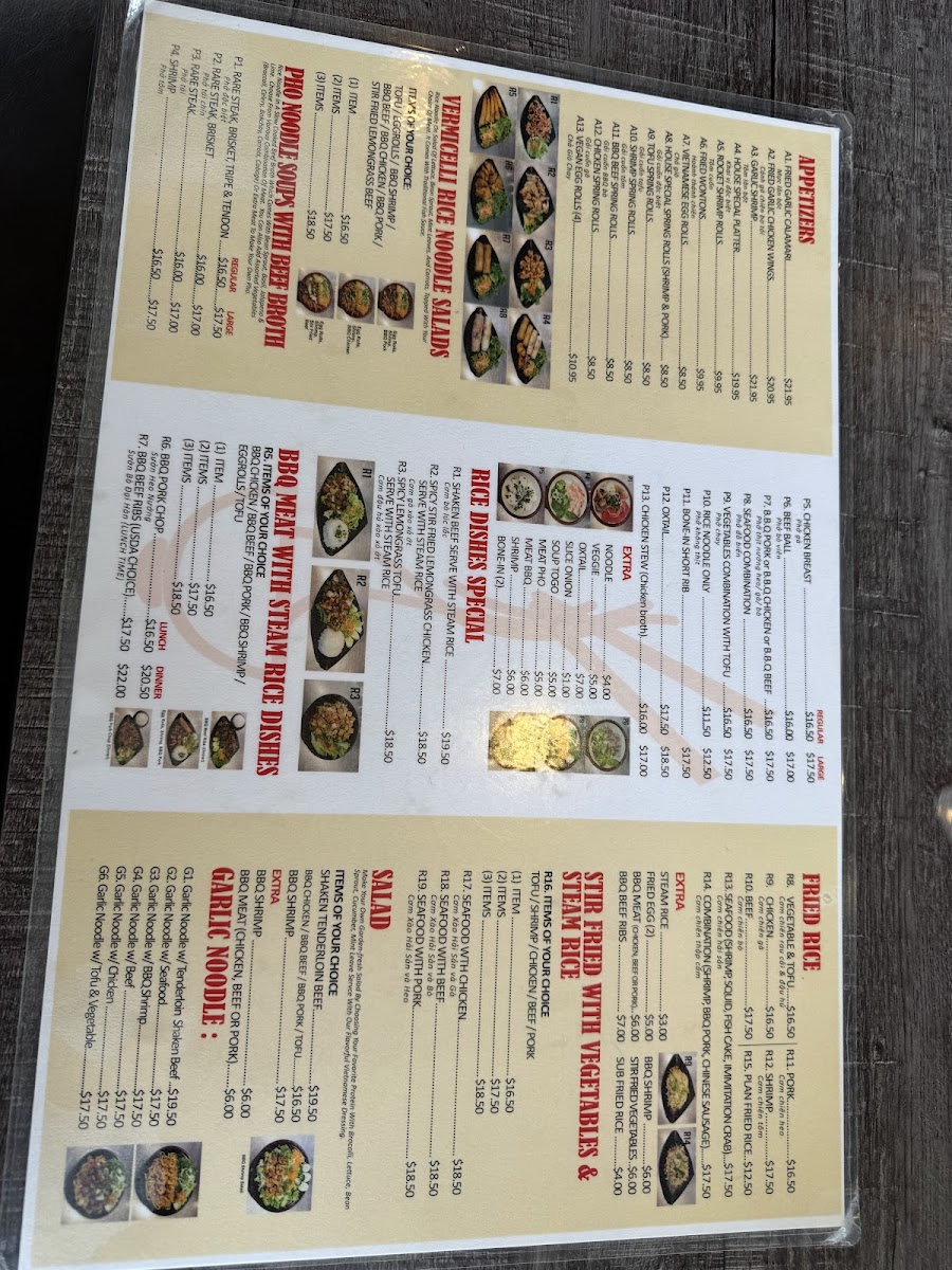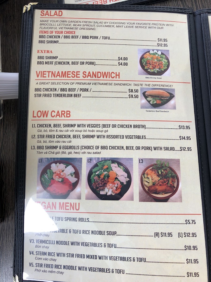 This menu features a variety of Vietnamese and Southeast Asian dishes with a focus on pho, soups, and fast casual dining options. It is structured to offer a range of choices including main courses, appetizers, salads, and beverages suitable for lunch, dinner, or quick meals.