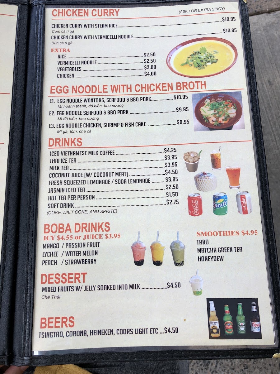 Beverages are diverse, including soft drinks, jasmine iced tea, Vietnamese iced milk coffee, Thai iced tea, coconut juice with coconut meat, and freshly squeezed lemonade. These drinks complement both the pho and other menu items, providing traditional and refreshing options.