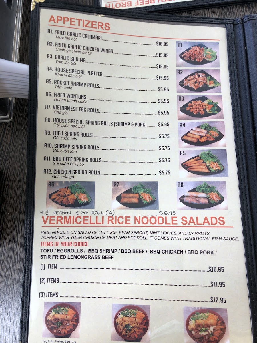 The food section includes traditional pho soups with options such as rare steak, brisket, tripe, and tendon, alongside combination vegetable pho. The menu also offers stir-fried dishes served with vegetables and steamed rice, with various protein choices including seafood, chicken, beef, pork, and tofu. Appetizers like spring rolls, fried garlic chicken wings, and appetizer platters provide lighter options or starters. Salads featuring grilled or BBQ meats and tofu are also available, served with fresh vegetables and rice.